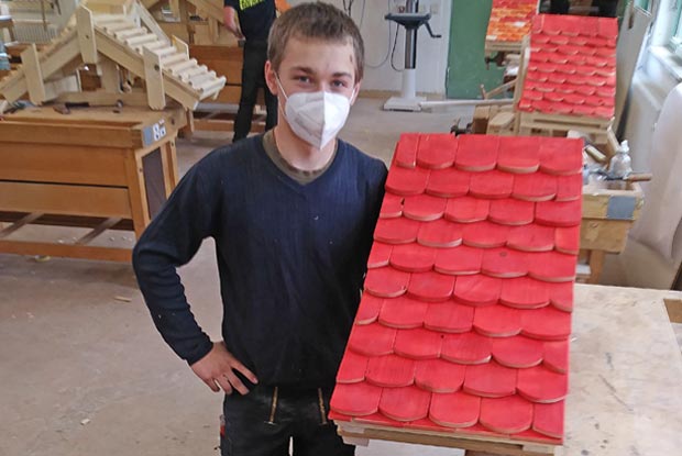 Aktuell ist aber wieder Berufsschule in Traunstein angesagt. Der Fachlehrer für Zimmerer-Praxis Alexander Sedlmaier erklärt: „Bis Pfingsten bleiben wir noch bei den Dachstühlen und wechseln dann in den Treppenbau.“ Vor kurzem haben Maxi Kirr und seine Schulkollegen ein Modell eines einfachen Pfettendachstuhls gebaut. Er erzählt „Die Schwierigkeit war, die Dachlatten mit der Handsäge auf die richtige Länge zu bringen, so dass die Dachschindeln gut draufpassen."